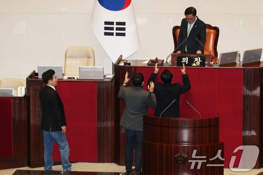 2024년 12월 3일 밤 윤석열 대통령이 비상계엄령을 선포한 다음날 새벽 (4일)서울 여의도 국회 본회의장에서 박찬대 더불어민주당 원내대표와 박성준 원내수석부대표, 김용민 의원이 우원식 국회의장에게 본회의 개의를 요청하고 있다. .2024.12.4/뉴스1 ⓒ News1 이광호 기자 |