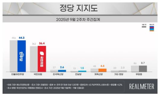 여론조사 전문회사 리얼미터가 에너지경제신문 의뢰로 지난 11~12일(9월 2주차) 전국 18세 이상 유권자 1001명을 대상으로 한 정당 지지도 조사에 따르면 민주당은 44.3%, 국민의힘은 36.4%로 집계됐다.