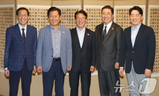김민석 국무총리와 정청래 더불어민주당 대표, 김병기 원내대표, 우상호 정무수석, 강훈식 대통령 비서실장이 14일 오후 서울 종로구 삼청동 총리 공관에서 열린 당정대 고위급 만찬회동에서 기념촬영을 하고 있다. 2025.9.14/뉴스1 ⓒ News1 이광호 기자 |