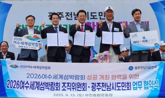 (재)2026여수세계섬박람회조직위원회(위원장 김영록 전라남도지사)와 광주전남시도민회(회장 양광용)는 최근 부천 종합운동장에서 열린 '광주전남시도민회 창립 70주년 기념 한마음 대축제'에서 업무협약을 체결했다.