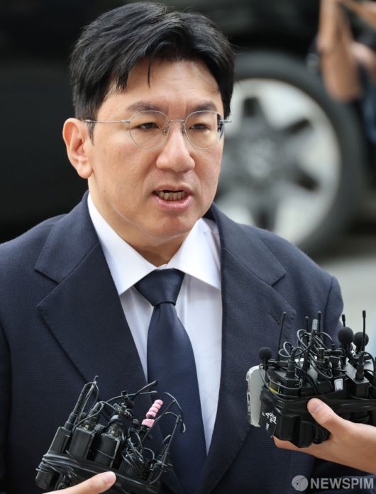 [서울=뉴스핌] 조준경 기자 = 사기적 부정거래 의혹을 받고 있는 방시혁 하이브 의장이 경찰의 포토라인에 섰다.
