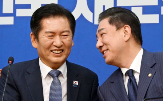 정청래 더불어민주당 대표와 김병기 원내대표가 15일 서울 여의도 국회에서 열린 최고위원회의에서 웃으며 대화하고 있다. 성형주 기자 foru82@sedaily.com[ⓒ 서울경제, 무단 전재 및 재배포 금지]