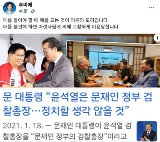 추미애 더불어민주당 의원이 15일 자신의 페이스북에 최근 이낙연 전 국무총리가 문재인 전 대통령을 만나 활짝 웃으며 대화를 나누는 사진과 함께 문 전 대통령이 "윤석열 총장은 정치를 하지 않을 것"이라고 말한 내용의 신문기사 내용을 함께 올리면서 문 전 대통령에 대한 불편한 심경을 여지없이 드러냈다.