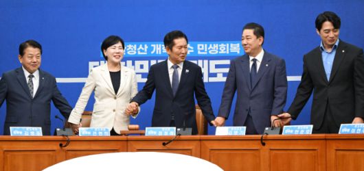 정청래 더불어민주당 대표와 김병기 원내대표 등 최고위원들이 15일 서울 여의도 국회에서 열린 최고위원회의에서 인사 전 서로 손을 잡고 있다. 성형주 기자 foru82@sedaily.com[ⓒ 서울경제, 무단 전재 및 재배포 금지]