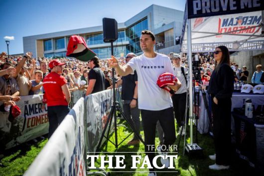 미국 우익 활동가였던 찰리 커크의 암살에 대한 비하성 발언을 한 이들의 징계 및 해고 조치가 이어지고 있다. 사진은 찰리 커크가 10일(현지 시간) 유타주 오렘 유타밸리대학에서 열린 행사에 참석해 연설에 앞서 모자를 나눠주는 모습. /뉴시스 |