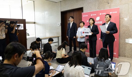 (서울=뉴스1) 이승배 기자 = 나경원 국민의힘 의원을 비롯한 법사위원들이 15일 서울 여의도 국회에서 민주당·대통령실의 대법원장 사퇴 촉구 및 내란특별재판부 규탄, 중단된 이재명 대통령 5개 재판 신속재개 등을 촉구하는 기자회견을 하고 있다. 2025.9.15/뉴스1