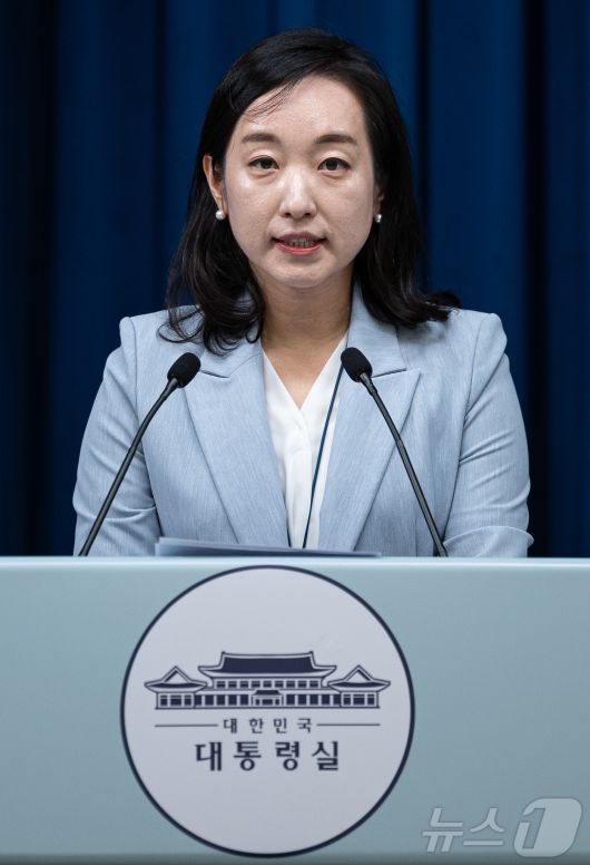 (서울=뉴스1) 이재명 기자 = 전은수 대통령실 부대변인이 15일 서울 용산 대통령실 청사에서 비서실장 주재 수석보좌관회의 관련 브리핑을 하고 있다. 2025.9.15/뉴스1