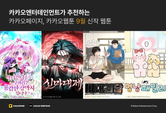 카카오엔터테인먼트는 카카오페이지와 카카오웹툰을 통해 9월 화제의 신작 웹툰 4종을 공개했다고 15일 밝혔다. 이번 신작은 로맨스판타지, 무협, 미스터리 스릴러, 육아툰 등 장르를 아우르며 독자층을 확장한다.