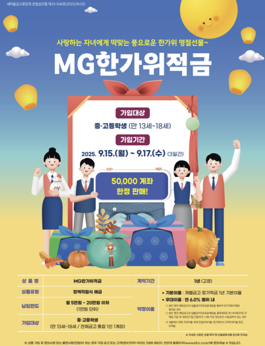 MG한가위적금은 1년 만기 상품으로 5만 계좌 한도로 출시됐다. 예금 판매일 기준 만 13~18세 중고생이라면 누구나 가입 가능하며 이날부터 17일까지 3일간 한정 판매된다. 월 최대 20만 원까지 납입할 수 있으며 금고별 정기적금(1년) 기본금리에 최대 연 6%의 우대 이율을 제공한다.