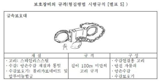 현행 형의 집행 및 수용자의 처우에 관한 법률은 보호 장비 사용을 ‘필요 최소한’으로만 허용하며, 징벌 수단으로의 사용은 금지한다. 하지만 일부 교도관들은 “징벌을 두려워하지 않는 수용자에겐 신체적 고통을 줘야 규율 위반을 막을 수 있다”고 진술한 것으로 확인됐다. 인권위는 “이는 법률상 명백히 금지된 행위”라고 지적했다.