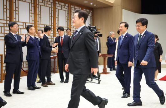 이재명 대통령이 15일 용산 대통령실에서 임명장 수여식을 마친 뒤 참석자들과 차담회를 위해 행사장을 나서고 있다. [사진=연합뉴스] |