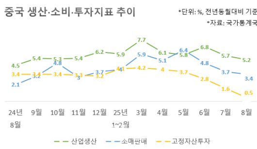 산업·소비 지표가 부진한 이유는 지난달 폭우·폭염 등 계절적 영향과 함께 대내외 수요가 줄었기 때문으로 풀이된다. 실제 8월 중국 수출액(달러 기준)과 수입액은 전년동월대비 각각 4.4%, 1.3% 증가해 전월(7.2%, 4.1%)보다 크게 둔화했다.