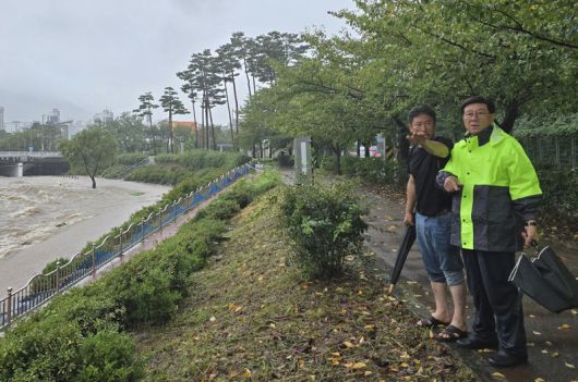 지난해 여름철 집중호우 기간, 부산 기장군 정관신도시 방곡지구 일대 좌광천을 찾은 정종복 기장군수(오른쪽)가 침수 우려 상황을 살피고 있는 모습. 부산 기장군 제공 |