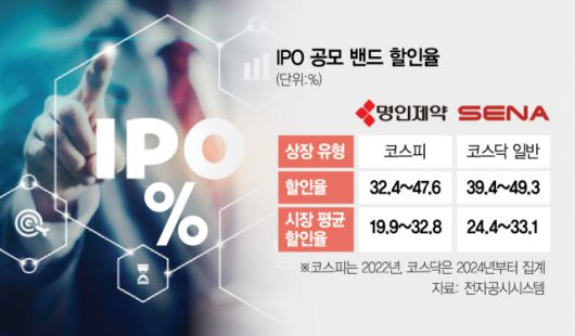 새로운 IPO 제도는 주식을 배정받은 기관의 의무 보유 확약 물량이 40%(올해는 30%)에 미치지 못하면 주관 증권사가 공모주의 1%를 6개월 동안 보유하도록 하고 있다. 지난해 IPO를 진행한 77개 기업의 평균을 냈을 때 기관이 일정 기간 주식을 보유하겠다고 약속한 경우는 19%에 그쳤다. 명인제약은 공모 규모가 1530억~1972억 원으로 커 대형 기관의 보유 확약을 이끌어내야 한다. IB 업계 관계자는 “50%에 근접하게 할인율을 높인 것은 장기 보유 성향이 높은 대형 기관 투심을 고려한 조치일 것”이라고 말했다.