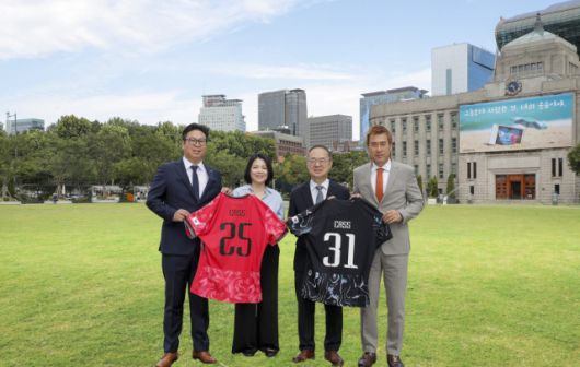 오비맥주는 15일 대표 브랜드 카스가 대한축구협회(KFA)와 공식 파트너 계약을 체결했다고 밝혔다. 사진은 지난 12일 서울광장에서 열린 조인식에서 오비맥주와 대한축구협회 관계자들이 기념 촬영하는 모습. 왼쪽부터 정병욱 오비맥주 상무, 서혜연 부사장, 이용수 대한축구협회 부회장, 김병지 부회장.조태형 기자 phototom@sedaily.com[ⓒ 서울경제, 무단 전재 및 재배포 금지]