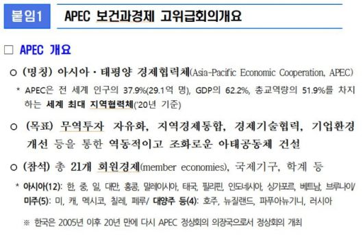 이 회의는 올해 APEC 정상회의 의장국으로서 한국이 개최하는 장관급회의로 정은경 보건복지부 장관이 의장으로 회의를 주재한다. 21개 회원경제 장·차관 등 고위급 인사, 세계보건기구 서태평양사무처(WHO WPRO), 경제협력개발기구(OECD), 아시아 개발은행(ADB) 등 국제기구 인사와 기업인 등 480여명이 참석한다.
