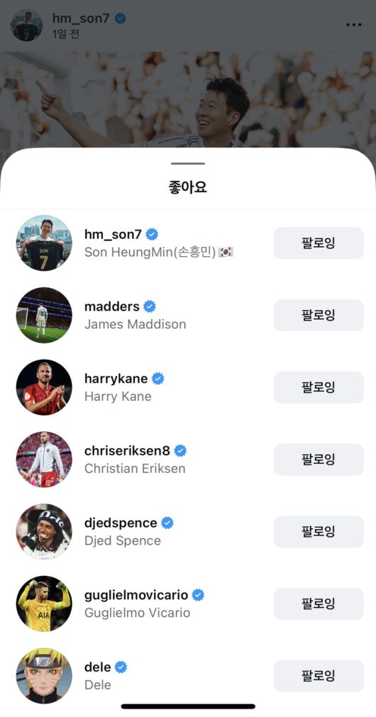 토트넘에서 함께 활약한 굴리엘모 비카리오, 아치 그레이, 도미닉 솔란케, 데스티니 우도기, 제임스 매디슨은 '좋아요'를 누르며 손흥민의 골과 승리를 축하했다. 과거 토트넘에서 'DESK 라인'을 구성했던 크리스티안 에릭센, 해리 케인, 델레 알리 또한 '좋아요'로 손흥민에게 애정을 드러냈다.