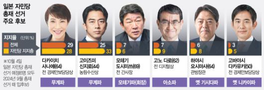 일본 집권 여당인 자민당 총재 선거를 약 3주 앞두고 다카이치 사나에 전 경제안보담당상과 고이즈미 신지로 농림수산상이 양강 구도를 굳히고 있는 것으로 나타났다. 자민당의 연이은 패배가 경제문제에서 비롯된 만큼 차기 지도자를 뽑는 이번 선거 역시 경제문제 해결 능력이 승패를 좌우할 것이라는 분석이다.