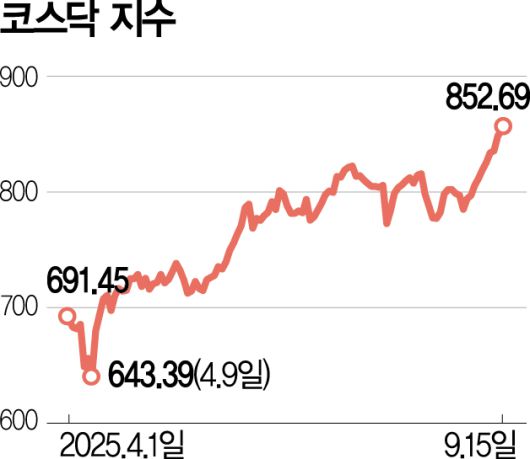 15일 한국거래소에 따르면 코스닥지수는 이날 전 거래일 대비 5.61포인트(0.66%) 오른 852.69에 장을 마쳤다. 지수는 이달 2일부터 10거래일 연속 상승했다. 코스닥지수가 10거래일 연속 상승한 건 2021년 9월 3일 이후 4년 만이다. 상승률(1~15일)로 따지면 약 8.6%로 같은 기간 코스피 상승률(약 8.4%)보다 소폭 높았다.