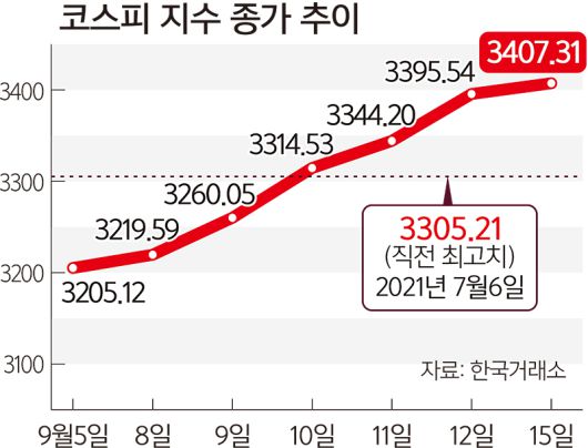 시장 안팎에서 이런 전망이 고개를 들었던 지난 10일부터 주식시장은 요동치기 시작했다. 정부의 세제 개편안 발표로 촉발된 ‘검은 금요일’(7월31일) 이후 3200선 박스권에 있던 코스피는 정부의 입장 변화가 감지된 10일 3300선을 넘었고, 이재명 대통령이 취임 100일 기자회견으로 주식 양도세 부과 대상 기준에 대해 사실상 철회를 시사한 11일 종가기준 3344.20을 기록하며 사상 최고치를 갈아치웠다. 이어 12일 3395.54로 최고점을 다시 높이고, 이날 3407.31로 마감하며 역사상 첫 3400 고지를 밟았다.