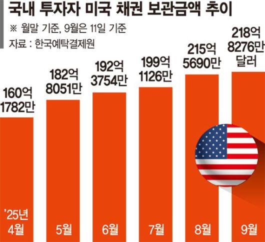 지난해 말 113억166만달러에 불과했던 미국 채권 보관금액은 지난달부터 증가 속도가 가팔라졌다. 지난 7월 말 199억1126만달러에서 8월 말 215억5690만달러로 한달 만에 8% 확대됐다. 이달 들어서도 3억2585만달러가 늘어났다.
