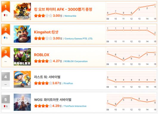 상위권에서는 ‘로블록스’가 최근 불안정한 순위를 털어내고 3위로 재진입했고, ‘라스트워: 서바이벌’은 치열한 경쟁 끝에 4위에 자리했다. ‘WOS: 화이트아웃 서바이벌’ 역시 오르락내리락을 반복하다가 결국 5위에 안착했다. 반면, 출시 직후 1위를 기록하며 주목을 모았던 ‘뱀피르’는 2위를 지키다 이번 주 6위로 내려앉으며 뼈아픈 하락을 경험했다.