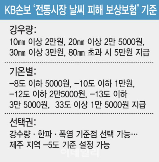 15일 보험업계에 따르면 KB손해보험은 내달 ‘전통시장 날씨 피해 보상보험’을 단체보험상품으로 선보인다. 이 상품은 강우량, 폭염, 최저·최고 기온 등을 바탕으로 기후 지수를 정해 보험금을 지급한다. 피해가 발생하면 보험금 신청 후 3~5일내로 받을 수 있다. 풍수해보험은 보험금 지급까지 평균 2주가 걸려 이를 고려하면 지급시간을 대폭 줄였다.