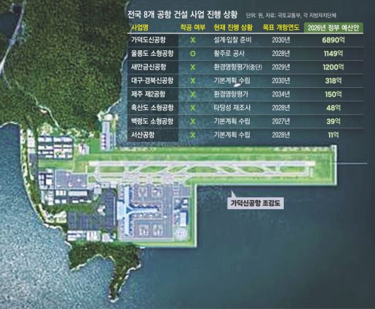 15일 정부가 추진 중인 전국 공항 건설사업 현황을 보면, 내년도 정부 예산이 배정된 사업은 총 8개다. 제주 제2공항을 제외한 7개 사업이 2030년 이전 개항을 목표로 하지만 대부분 목표를 달성할 수 없는 현실이다. 현재 착공한 곳은 울릉공항 1곳뿐이다. 활주로 공사가 진행 중인 울릉공항은 지난 8월 기준 공정률이 66%다.