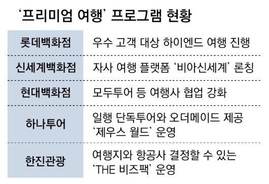 롯데백화점은 5월 에비뉴엘 최상위 등급 고객을 대상으로 울릉도의 럭셔리 리조트 ‘빌라 쏘메’ 패키지를 출시해 큰 호응을 얻었다. 현대백화점도 11월 모두투어와 손잡고 프리미엄 여행 상품을 선보일 예정이다.