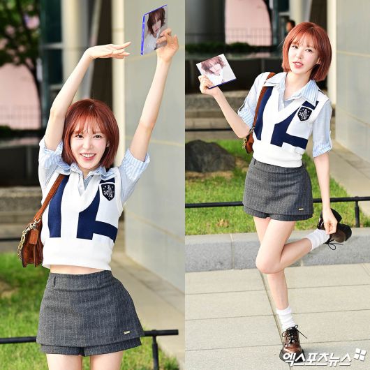 이날 웬디는 블루 스트라이프 셔츠에 흰색 V넥 니트 베스트를 레이어드한 스쿨룩 느낌의 패션으로 출근길에 나섰다. 차콜 컬러의 짧은 치마 바지를 매치해 프레피 룩 스타일의 캐주얼한 코디로 발랄한 매력을 선보였다.