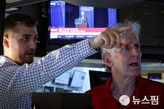 22일(현지시간) 뉴욕증권거래소(NYSE)에서 트레이더들이 제롬 파월 미 연방준비제도(Fed) 의장의 잭슨홀 심포지엄 연설을 듣고 있다.[사진=로이터 뉴스핌] 2025.08.23 mj72284@newspim.com |
