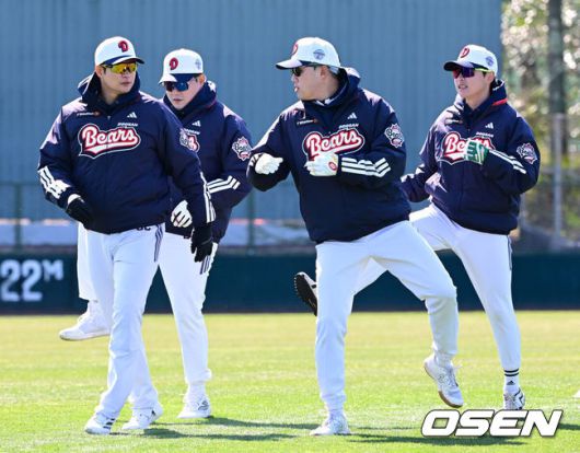 [OSEN=미야자키(일본), 지형준 기자] 25일 일본 미야자키 히나타 히무카 스타디움에서 두산 베어스 2차 스프링캠프 훈련이 진행됐다.두산은 이날 팀 훈련으로 전열을 정비한 뒤 26일 세이부 라이온스와 스프링캠프 4번째 연습경기를 갖는다.두산 김재환, 양의지, 양석환, 정수빈이 훈련을 하고 있다. 2025.02.25 /jpnews@osen.co.kr |