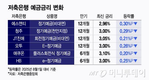 에스앤티저축은행의 1년 만기 비대면 정기예금 금리는 지난달 1일 연 3.26%였지만 이날 기준으로는 2.96%를 기록해 0.30%P 하락했다. 청주저축은행의 천안지점 정기예금 금리도 같은 기간 3.29%에서 3.00%로 0.29%P 내렸다. 애큐온·HB저축은행의 6개월 만기 정기예금 금리도 같은 기간 0.20~0.25%P 내렸다.