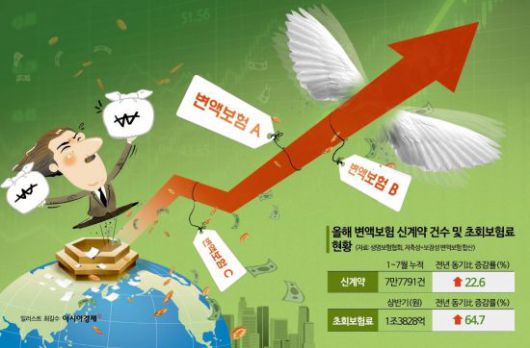 16일 생명보험협회 통계를 보면 올해 1~7월 변액보험(보장성·저축성) 신계약 건수는 7만7791건으로 전년 동기 대비 22.6% 늘었다. 신규 계약이 늘면서 초회보험료도 증가했다. 올해 상반기 변액보험 초회보험료는 1조3828억원으로 전년 동기(8395억원)와 비교해 64.7% 급증했다. 변액보험은 가입자가 낸 보험료 일부를 주식·채권·펀드 등에 투자해 운용 성과에 따라 연금액이나 환급금이 달라지는 상품이다.