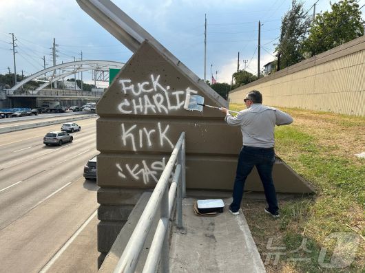 테드 크루즈 미 상원의원(공화·텍사스)이 14일(현지시간) 텍사스주 휴스턴에서 총격으로 사망한 찰리 커크(31)를 언급한 낙서를 지우고 있다. 2025.09.14. ⓒ 로이터=뉴스1 ⓒ News1 윤다정 기자 |