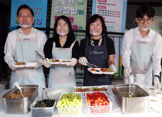 [이데일리 김태형 기자] 맹석인(왼쪽부터) 서울농협본부장, 이혜영 서울시 아이돌봄담당관, 김금이 중랑구 우리동네키움센터장, 전재호 서울농협경제지원단장이 16일 오전 중랑아동돌봄센터 1호점에서 돌봄아동들에게 배식을 하고 있다.