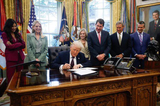 도널드 트럼프 미국 대통령이 15일 백악관 집무실에서 테네시주 멤피스에 주방위군과 연방법 집행 기관 요원 파견을 지시하는 명령에 서명하고 있다. 사진 왼쪽부터 크리스티 놈 국토안보부장관, 팸 본디 법무장관, 마샤 블랙번 상원의원, 빌 해거티 상원의원, 빌 리 테네시 주지사, 피트 헤그세스 국방부장관.(사진=AFP) |