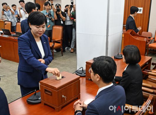 아시아투데이 송의주 기자 = 16일 국회에서 열린 법제사법위원회 전체회의에서 더불어민주당 의원들이 나경원 국민의힘 의원의 야당 간사 선임 안건에 대한 무기명 투표를 하고 있다. ⓒ "젊은 파워, 모바일 넘버원 아시아투데이"