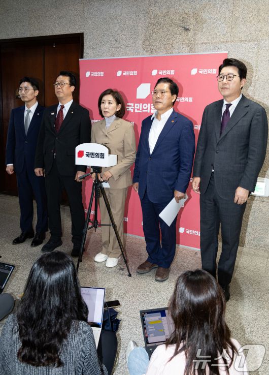 (서울=뉴스1) 유승관 기자 = 국회 법제사법위원회 국민의힘 위원들이 16일 서울 여의도 국회에서 열린 법사위 전체회의에서 무기명 투표를 통해 나경원 국민의힘 의원의 국민의힘 간사 선임의 건이 부결되자 기자회견을 하고 있다. 왼쪽부터 박준태, 곽규택, 나경원, 송석준, 신동욱 의원. 2025.9.16/뉴스1