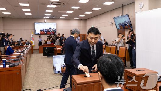 (서울=뉴스1) 이승배 기자 = 김용민 국회 법제사법위원회 여당 간사가 16일 서울 여의도 국회에서 제429회국회(정기회) 법제사법위원회 제4차 전체회의에서 나경원 국민의힘 의원 간사 선임의 건에 대해 무기명 투표하고 있다. 이날 나경원 의원 법사위 간사 선임의 건은 국민의힘 위원들의 불참 속에 무기명 투표로 진행됐다. 2025.9.16/뉴스1