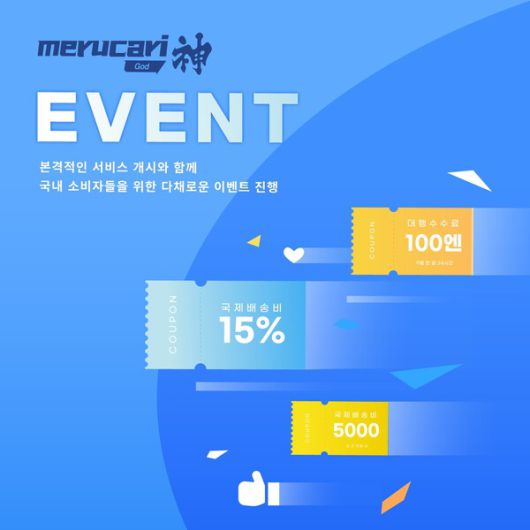 메루카리신은 서비스 개시를 기념해 풍성한 이벤트도 진행한다. 국제배송 요금 15% 할인, 신규 가입 시 5,000원 상당 국제배송비 할인 쿠폰 증정, 등급별 국제배송료 할인, 메루카리 대행수수료 100엔 특별 이벤트 등이 준비돼 있다. 특히 9월 한 달간은 24시간 주문 시 메루카리 대행수수료를 100엔으로 제공하는 혜택도 주어진다.