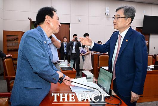 [더팩트ㅣ국회=남윤호 기자] 김석기 국회 외교통일위원장(왼쪽)이 16일 서울 여의도 국회에서 전체회의를 마친 후 조현 외교부 장관과 대화하고 있다.