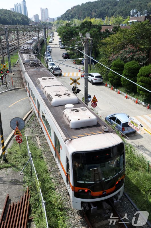 (부산=뉴스1) 윤일지 기자 = 16일 부산 금정구 부산교통공사 노포차량기지에 열차가 지나가고 있다. 부산지하철 노사 대표들은 이날 오후 임단협 최종교섭을 벌이고 있다. 노조는 최종교섭이 결렬되면 다음날인 17일 첫 차부터 파업에 나설 예정이다. 2025.9.16/뉴스1
