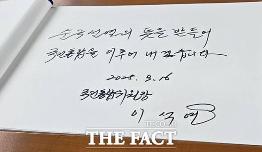 이 위원장은 방명록에 "순국선열의 헌신을 기리며 국민통합을 이루어 내겠습니다" 라고 남겼다.