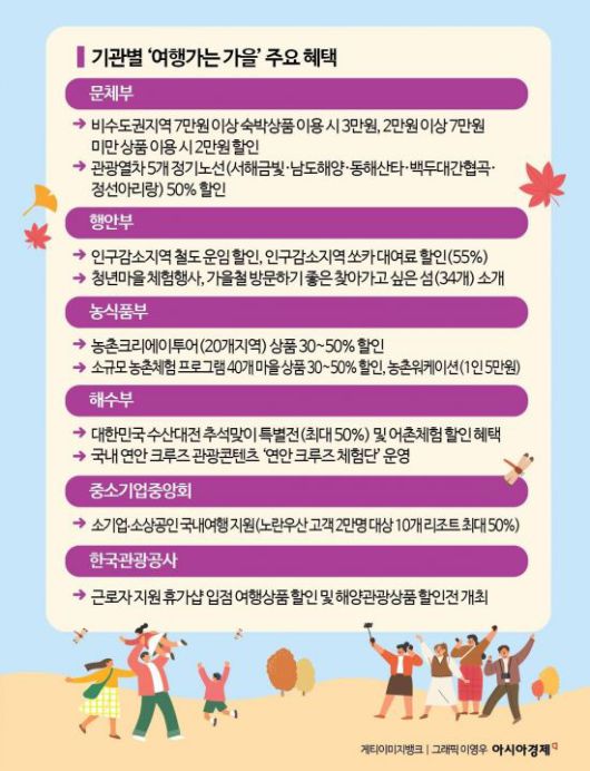 정부는 오는 11월까지 문체부와 한국관광공사 주도로 가을 여행 독려 캠페인을 진행한다. 교통·숙박·여행상품 등 대규모 할인 혜택과 함께, 주제별 여행상품 전시(여행트렌드관), 숨은 관광지 발굴, 인기 캐릭터 '잔망루피'를 활용한 행사 등을 통해 가을 여행 분위기를 확산하고 내수 경기를 활성화할 계획이다.