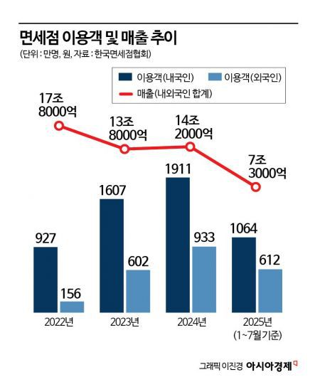 내국인을 합친 면세점 전체 구매 인원도 엔데믹(감염병 주기적 유행)이 본격화된 2022년 1083만명에서 지난해 2844만명으로 늘었지만, 매출액은 17조8000억원에서 14조2000억원으로 오히려 줄었다. 코로나19가 발생하기 전인 2019년과 비교하면 구매 인원은 41.3%, 매출액은 10조원 이상 감소했다. 올해에도 1~7월 기준 구매 인원은 1676만명으로 지난해 성적표를 넘어설 것으로 예상되지만 매출액은 7조3000억원으로 더딘 흐름이다.