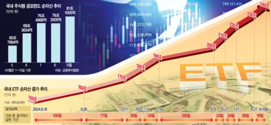 16일 한국거래소에 따르면 국내 ETF 순자산은 15일 기준 240조 2041억 원으로 지난해 말(172조 8556억 원) 대비 38.96% 증가했다. 230조 원에서 240조 원을 돌파하는 데 걸린 시간은 불과 19일로 직전 10조 원 증가까지 소요 시간(38일)을 절반이나 단축했다. 지난해 말과 올 초까지 해외주식형 ETF가 성장을 이끌었다면 새 정부 출범 이후에는 국내주식형 ETF의 역할이 컸다. 올해 주식형 ETF 순자산은 지난해 말 98조 2335억 원 대비 45% 증가한 141조 9914억 원을 기록했다. 황세운 자본시장연구원 연구위원은 “국내 증시가 반짝 상승에 그칠 가능성은 크지 않다”며 “증시 재평가 기대로 기준금리 인하 후에도 계속 자금이 들어올 것”이라고 짚었다.