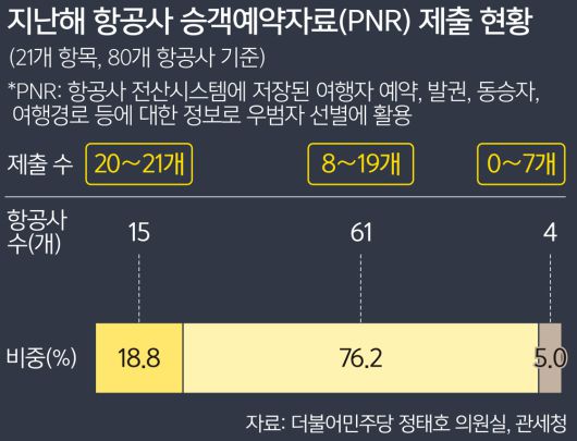 관세청 조사 결과 항공사 81.3%(80곳 중 65곳)는 PNR 항목 21개 중 2개 이상을 누락한 것으로 드러났다. 20개 이상을 제출하는 항공사는 15곳에 불과했다. PNR 제출률이 높은 항공사도 여행자의 주소와 전화번호 등 주요 항목을 제출하지 않고 있었다. 관세청 관계자는 “PNR 정보가 많을수록 현장에서 우범자를 추측하고 검사 대상을 선별하기 유리한데, PNR 제출률이 떨어지면 우범자 위험성을 판단하는 것 자체가 의미 없는 경우가 많다”고 말했다.