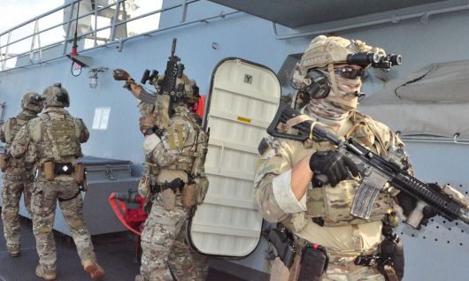 해군 UDT 장병들이 충무공이순신함에서 프리덤 에지 대해적훈련을 실시하고 있다. 합참 제공 |