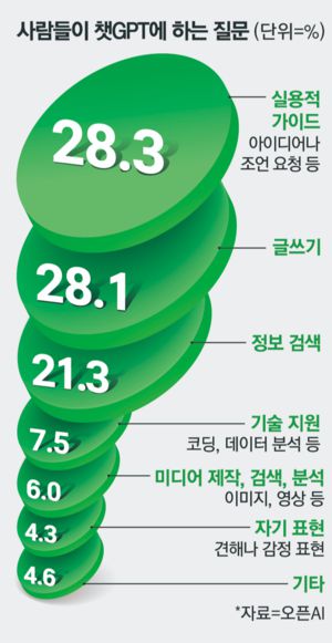 2022년 11월 처음 공개된 오픈AI의 생성형 인공지능(AI) 챗GPT는 보고서와 이메일 초안 작성, 코드 생성 등 업무 효율화 도구로 주목받았다. 하지만 요즘 사용자들이 챗GPT에게 가장 자주 하는 질문은 “여드름에 얼음찜질이 효과 있나요”, “오늘 저녁은 뭘 먹을까”, “아이와 함께 갈 문화 활동은” 등 일상에 관한 것으로 조사됐다.